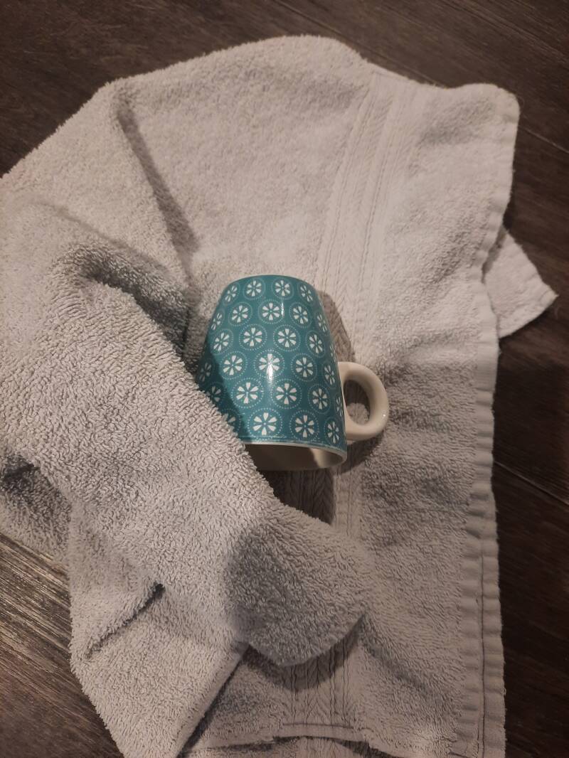 Voorzichtig schud ik een beetje aan de broekspijp en daar valt op de handdoek……een koffiekopje!